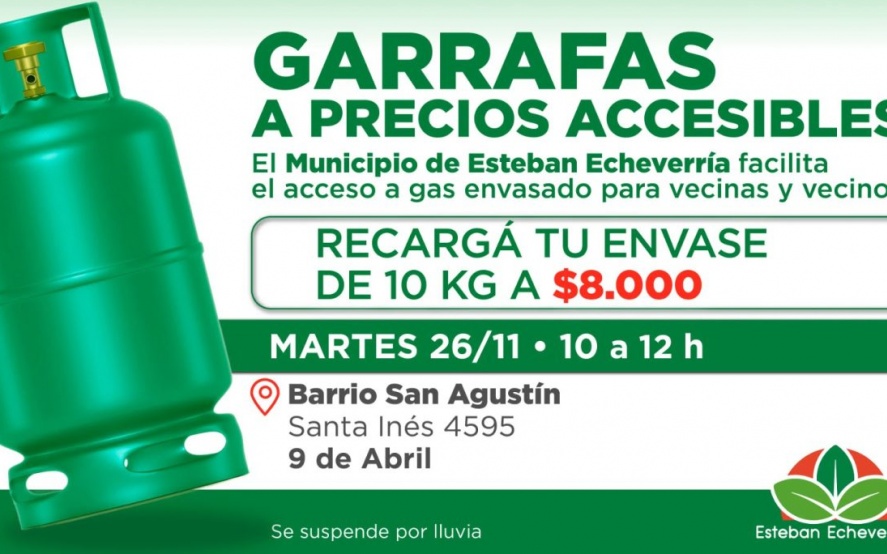 El martes 26 de noviembre, de 10 a 12 horas, el Municipio de Esteban Echeverría realizará un operativo para que las vecinas y los vecinos puedan recargar sus garrafas a valores accesibles en Santa Inés 4595, Barrio San Agustín, 9 de Abril.