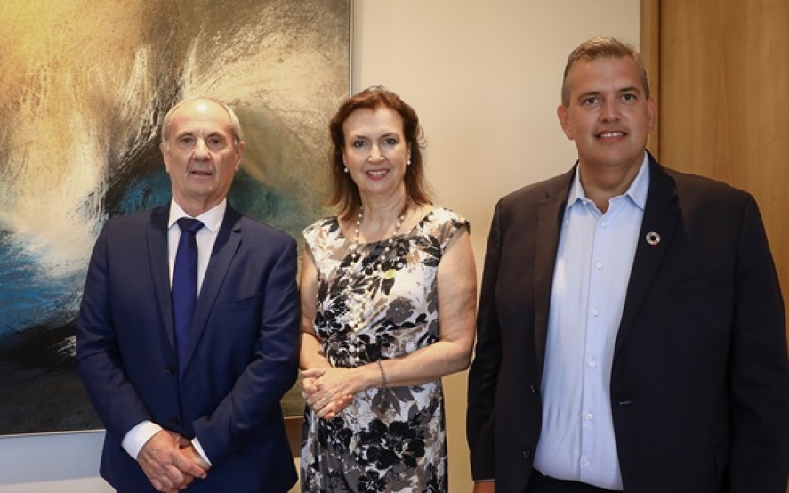 La Canciller Diana Mondino mantuvo una reunión con el Embajador de los Estados Unidos de América, Mark Stanley; el Ministro de Producción de la provincia de Santa Fe, Gustavo Puccini; el Vicepresidente Ejecutivo de la empresa Nitron, Tomás Novak; y el Presidente y CEO de PTP Group, Guillermo Misiano.